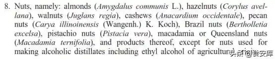 欧盟Regulation(EC)No1924/2006中,引起过敏或过敏的物质或产品列表中,有关坚果部分的描述如下: