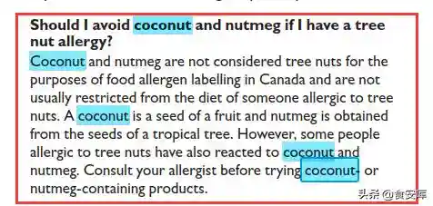 在加拿大政府的有关答复中,认为椰子不被视为需要进行过敏原标识的树坚果。截图如下: