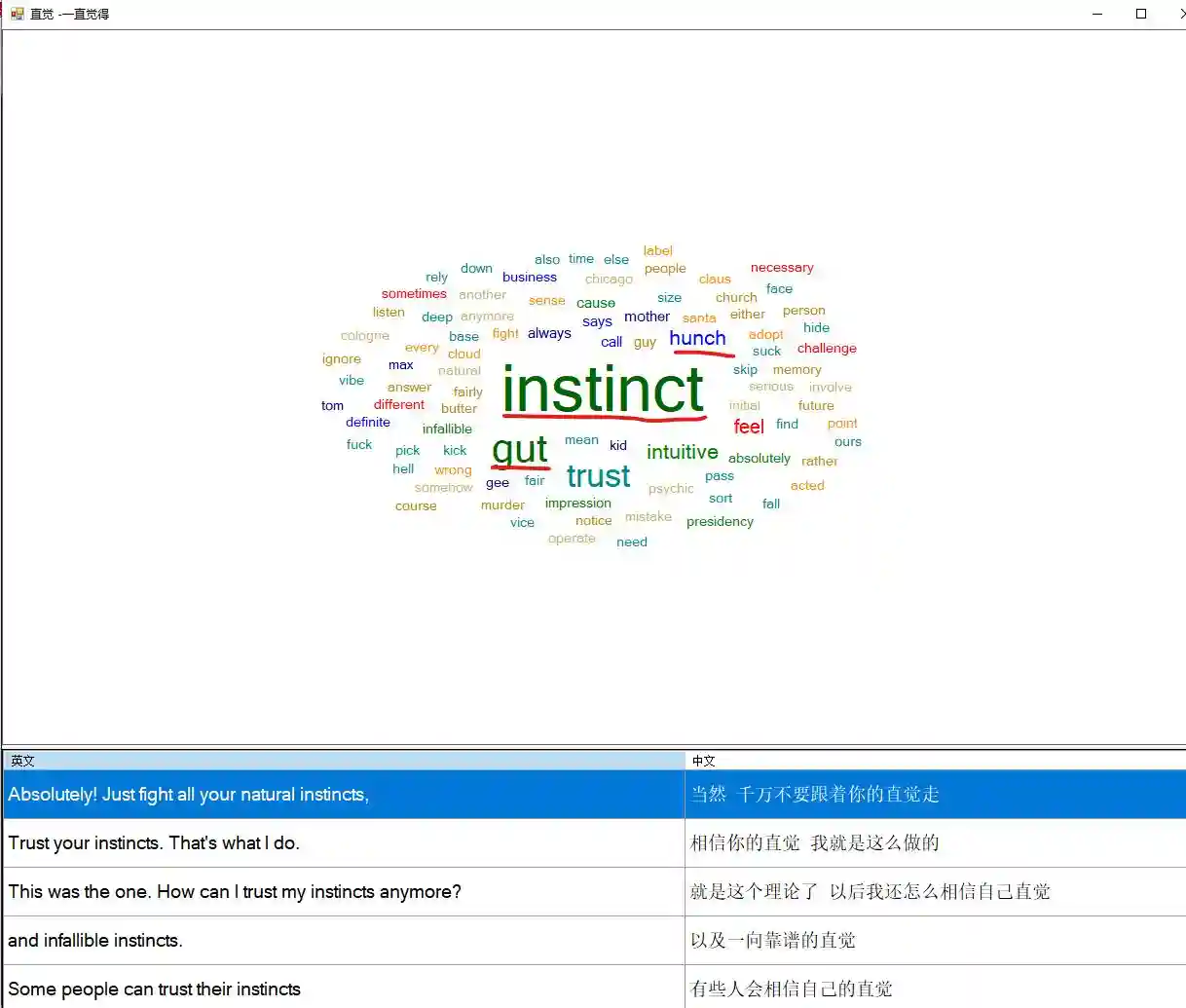 我们用美剧口语神器在十部流行美剧,80万口语对白中查一下,看看地道的口语表达“直觉”是什么?
