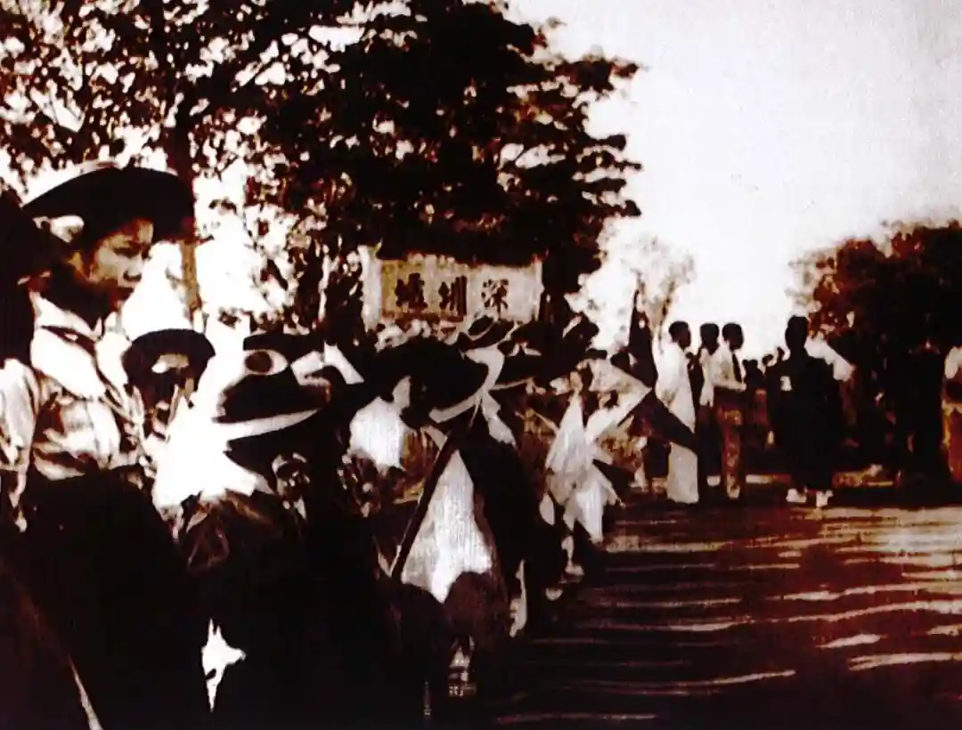 1949年10月,解放军南下接管深圳,当地居民在车站欢迎解放军。背后可清晰看到当时深圳车站的站名“深圳墟”。