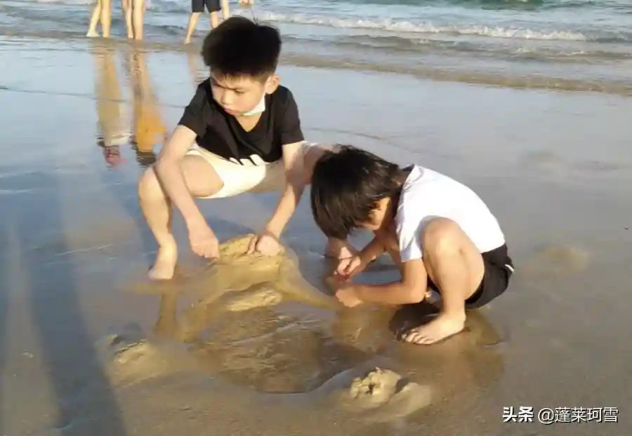 在沙滩上,人们或三三两两散步,或悠闲地在躺椅上休息,享受着日光浴。而最高兴的还是孩子们,他们有的捡贝壳、有的堆城堡、有的挖沙洞,然后看着海水把沙洞填满,再重建“工程”,玩得不亦乐乎……