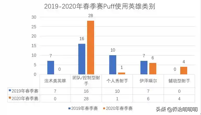 我们来看一个直观的统计图来对比一下Puff这两个赛季登场的英雄类型: