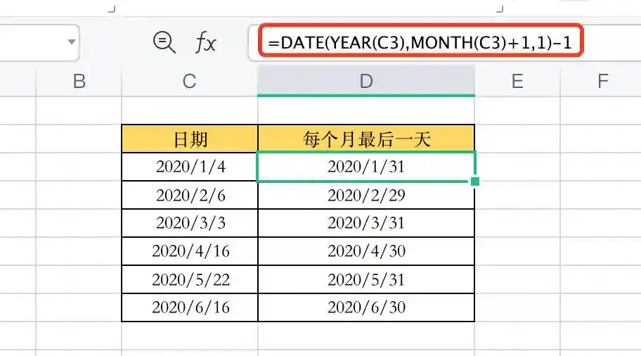 (二)方法二:使用EOMONTH函数在单元格中输入公式【=EOMONTH(C3,0)】