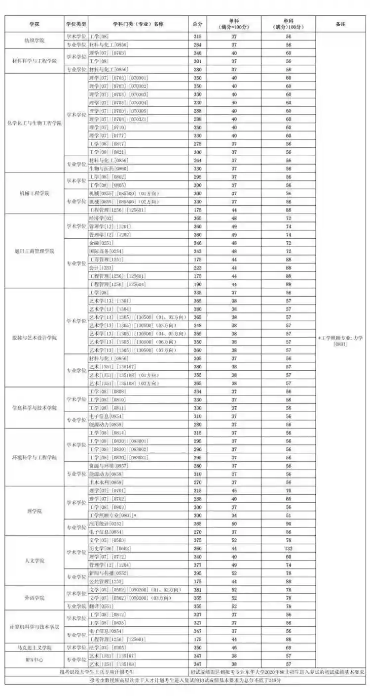 东华大学2020年硕士研究生招生考试考生进入复试的初试成绩基本要求
