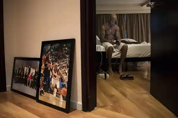早晨7点35分,马布里从睡梦中醒来。在他的卧室外摆放着96一代的合影。2月11日是马布里的最后一场职业比赛。