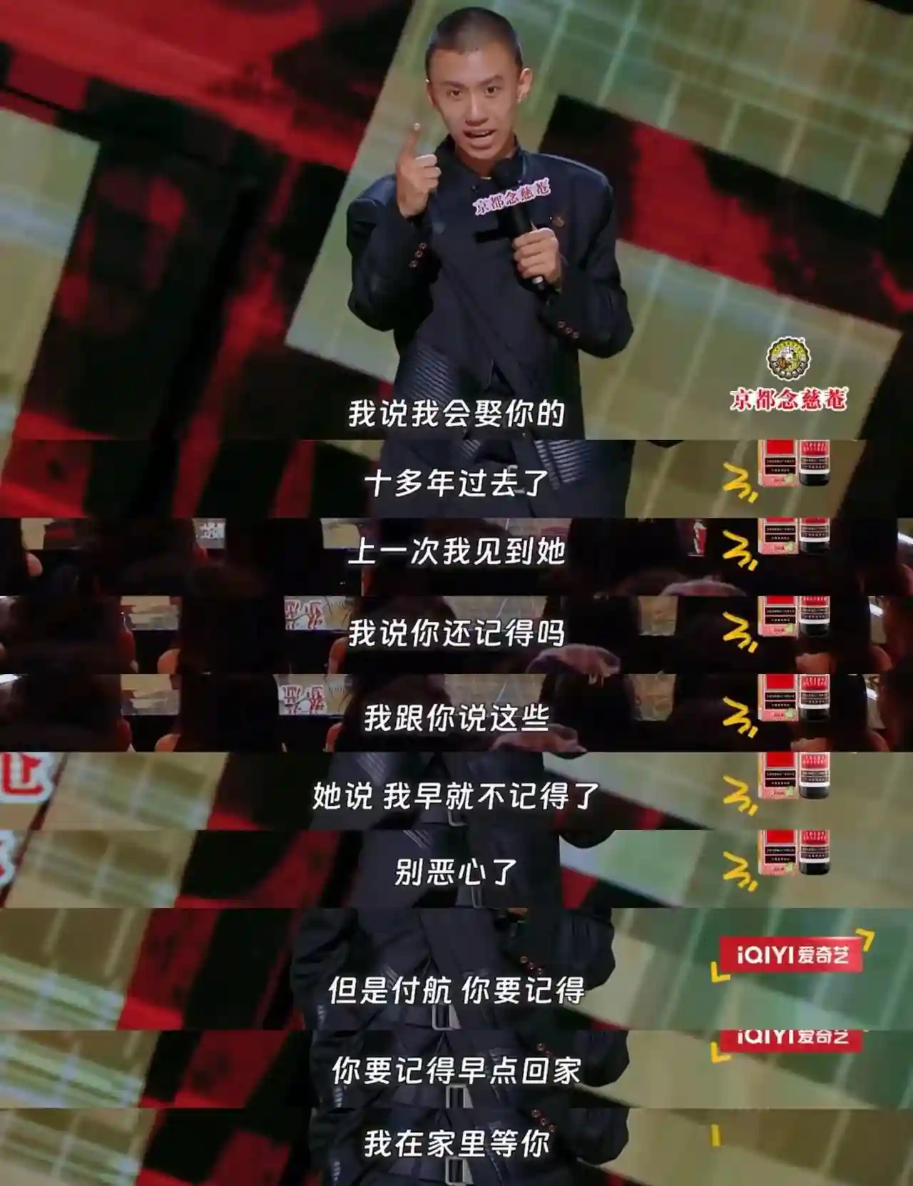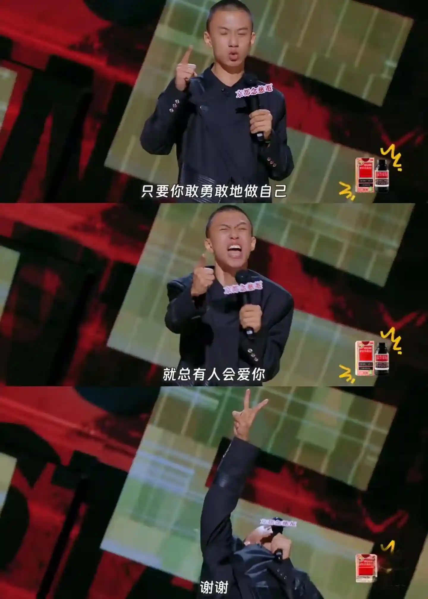 就像付航,他通过脱口秀分享了自己的一些经历和对生活的感悟。他提到节目播出后有很多人给他发私信,其中有人说自己上了大专不知该怎么办,还有人表示做人类很累,想做动物,付航则通过泰国农民训练猴子摘椰子的故事,说明动物也有烦恼。他还讲了自己表白失败带来容貌焦虑的故事,比如他曾学习忧郁男孩的表白方式,结果闹了笑话;他给女同学写情诗表白,却被说不喜欢长得像猴、黑黑的男孩。这让付航陷入痛苦,但他想起花泽类倒立的情节,也尝试后发现眼泪照样流下来,而女同学还说他在耍猴。付航表示自己曾有容貌焦虑,不过后来他意识到无法改变别人对自己容貌的评判,所以选择接受自己。他还分享了一个类似剧本杀的经历,拿到的角色是舔狗A,而女主角的剧本里根本没有他,由此他领悟到舔狗永远读不了女神的剧本,但在自己的剧本里舔狗才是主角,从此别人说不喜欢他,他就认为对方在自己的剧本里杀青了。最后他提到遇到了一个女孩,对方不在意他的保安身份,说他穿什么都很帅,付航表示这个女孩教会了他人生中重要的事——只要勇敢做自己,就总有人会爱你。