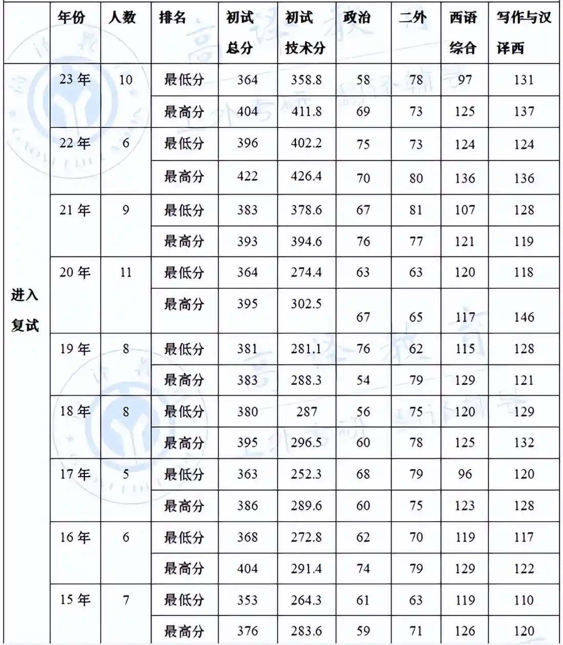 复试科目(满分500):专业笔试150分,考试时间1小时,题型为汉西翻译;专业面试350分,考试时间20分钟左右。。