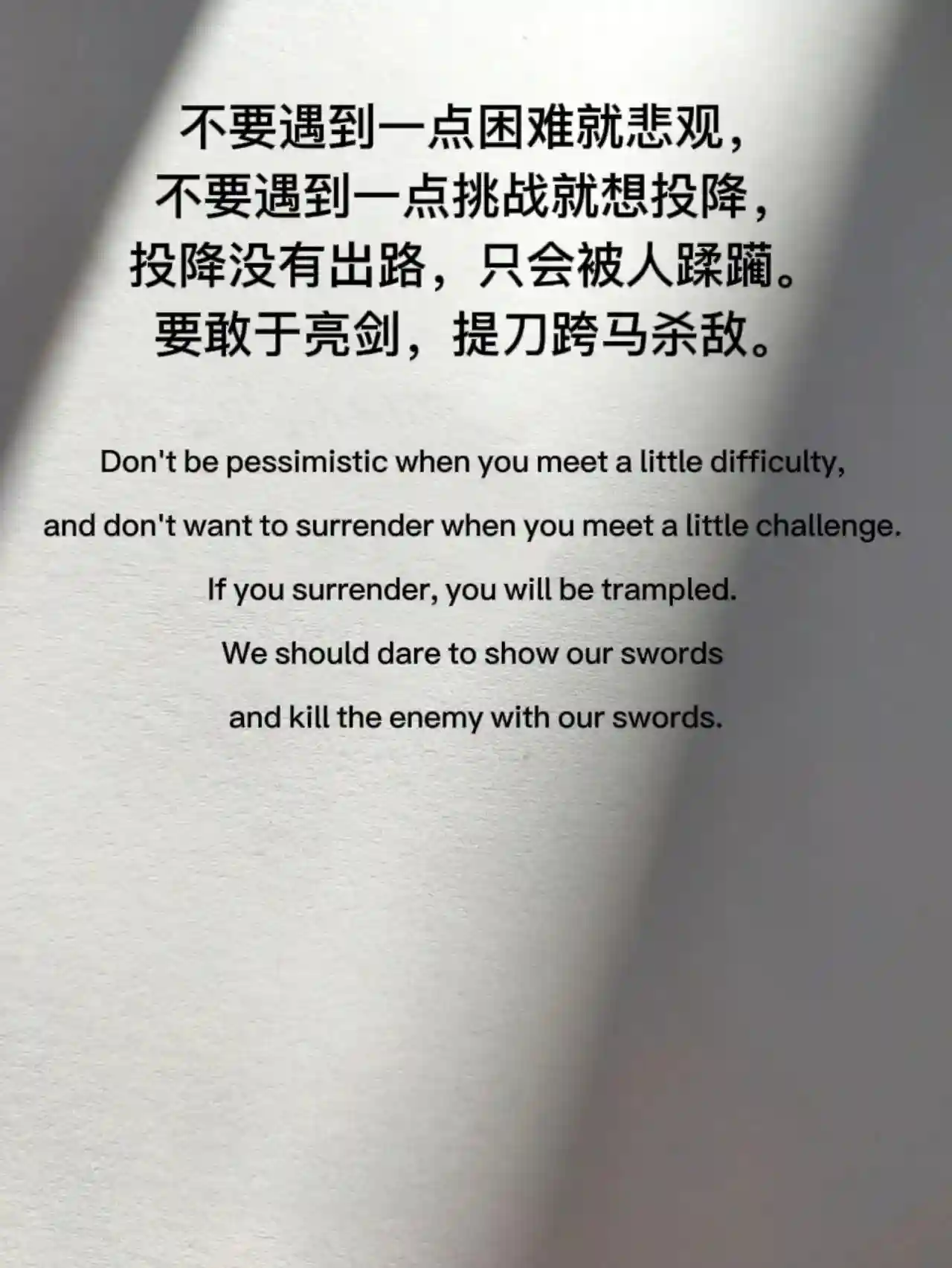 不要遇到一点困难就悲观,不要遇到一点挑战就想投降,投降没有岀路,只会被人蹂躏。要敢于亮剑,提刀跨马杀敌。