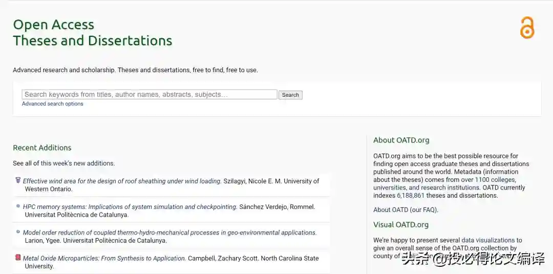 OpenAccessThesesandDissertations,简称OATD,旨在成为寻找在世界各地发表的开放获取研究生论文和学位论文的最佳资源。有关论文的信息来自1100多个学院、大学和研究机构。OATD目前索引了6,188,861篇论文和学位论文。