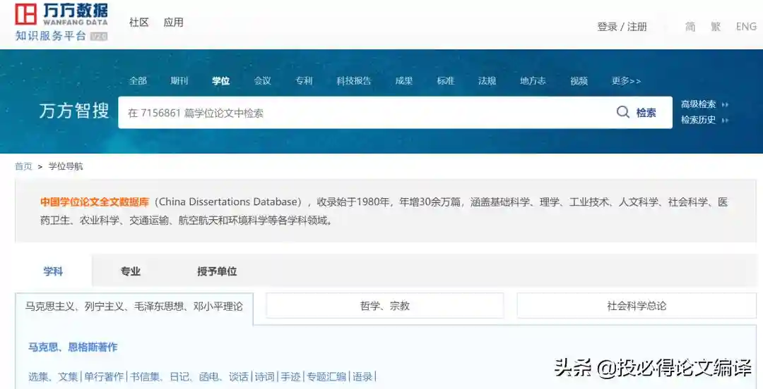 中国学位论文全文数据库(ChinaDissertationsDatabase),是万方数据知识服务平台的重要组成部分,精选全国重点学位授予单位的硕士、博士学位论文以及博士后报告。收录始于1980年,年增30余万篇,与国内600余所高校、科研院所等学位授予单位合作,占研究生学位授予单位的85%以上。内容涵盖基础科学、理学、工业技术、人文科学、社会科学、医药卫生、农业科学、交通运输、航空航天和环境科学等各学科领域。