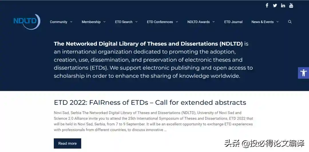 NetworkedDigitalLibraryofThesesandDissertations,简称NDLTD,由美国国家自然科学基金支持的一个网上学位论文共建共享项目,为用户提供免费的学位论文文摘,还有部分可获取的免费学位论文全文。目前全球有170多家图书馆、7个图书馆联盟、20多个专业研究所加入了NDLTD。和ProQuest学位论文数据库相比,NDLTD学位论文库的主要特点就是学校共建共享、可以免费获取。另外由于NDLTD的成员馆来自全球各地,所以覆盖的范围比较广,有德国、丹麦等欧洲国家和香港、台湾等地的学位论文。但是由于文摘和可获取全文都比较少,可作为国外学位论文的补充资源使用。