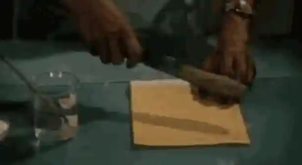 刀蘸了碱水,遇到纸上的姜黄就变成“血”了