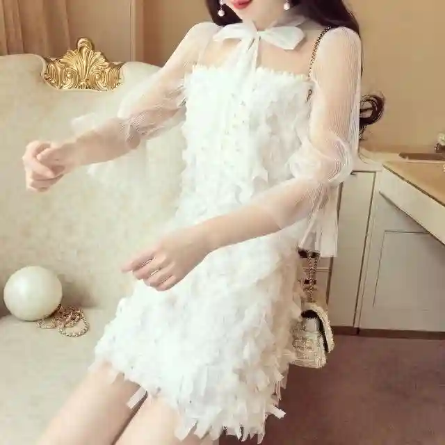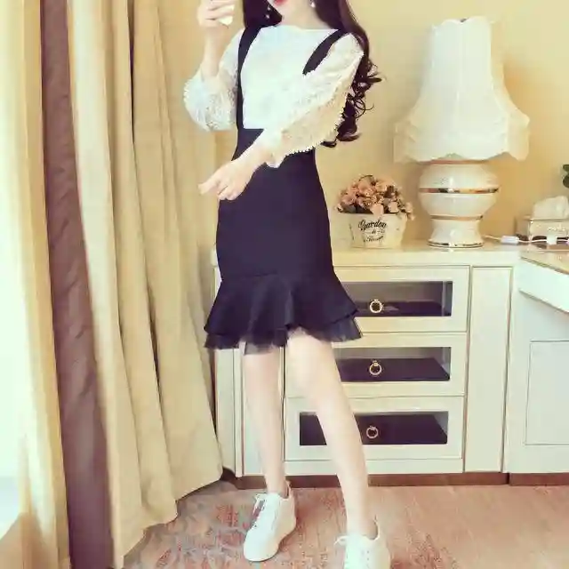 韩版春装甜美淑女蕾丝衬衫A字拼接网纱背带连衣裙两件套装女