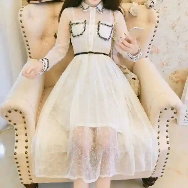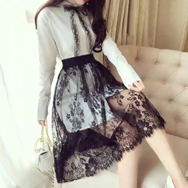 春季新款女装衬衣中长款蕾丝拼接镂空淑女气质连衣裙两件套女