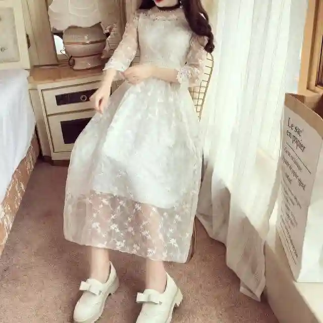 春新款韩国甜美淑女气质刺绣蕾丝花朵勾花高腰长款复古连衣裙
