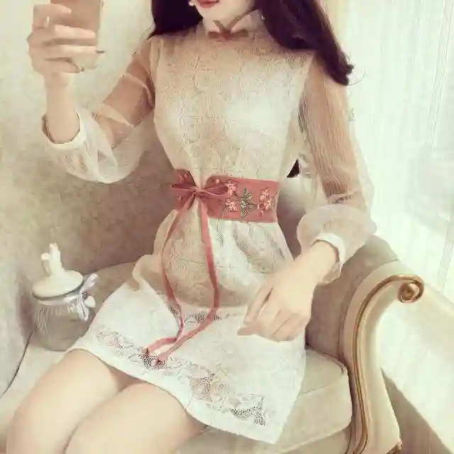 韩版春新款立领拼接透视灯笼袖刺绣花朵腰带复古淑女旗袍式连衣裙