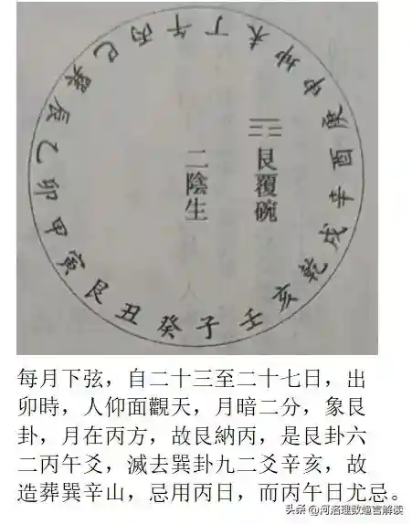 初八、初九之月,二陽在下,一陰在上,象兑卦☱,戌時月在丁方,故兑納丁,兑屬金,巳酉丑金,故支之巳丑亦屬丁。