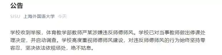 当天下午,上海外国语大学公众号发布公告表示,已对当事教师做出停课处理决定,并启动调查。