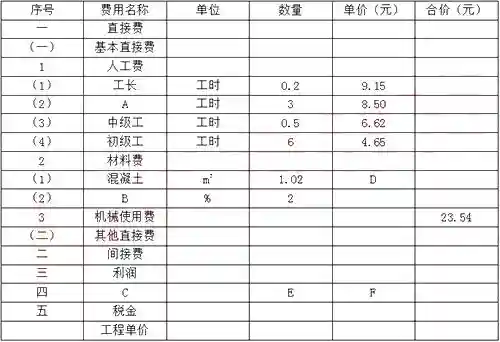 D:200.00;E:1.02;F:80.00。基本直接费:290.16。