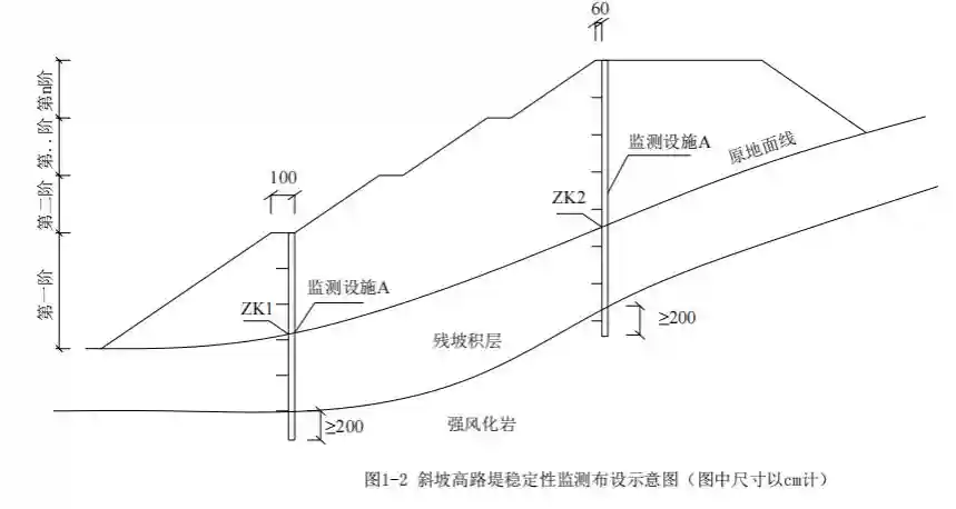 为提高施工安全与施工质量,施工单位对斜坡高路堤进行了稳定监测,稳定监测设施按图1-2中所示位置布设,纵向按每200m间距布置一处,并优先安排斜坡高路堤施工,预留了5个月的沉降期。斜坡高路堤完工后,路堤沉降稍大,经处理合格后,通过验收。