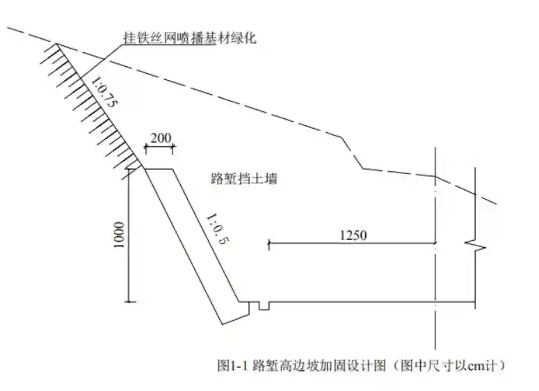 K2+100~K2+500段路堑施工中,第一级边坡采用路堑挡土墙加固,第二级采用挂铁丝网喷播基材绿化封闭,防治坡面风化剥落,路堑高边坡加固设计如图1-1所示。