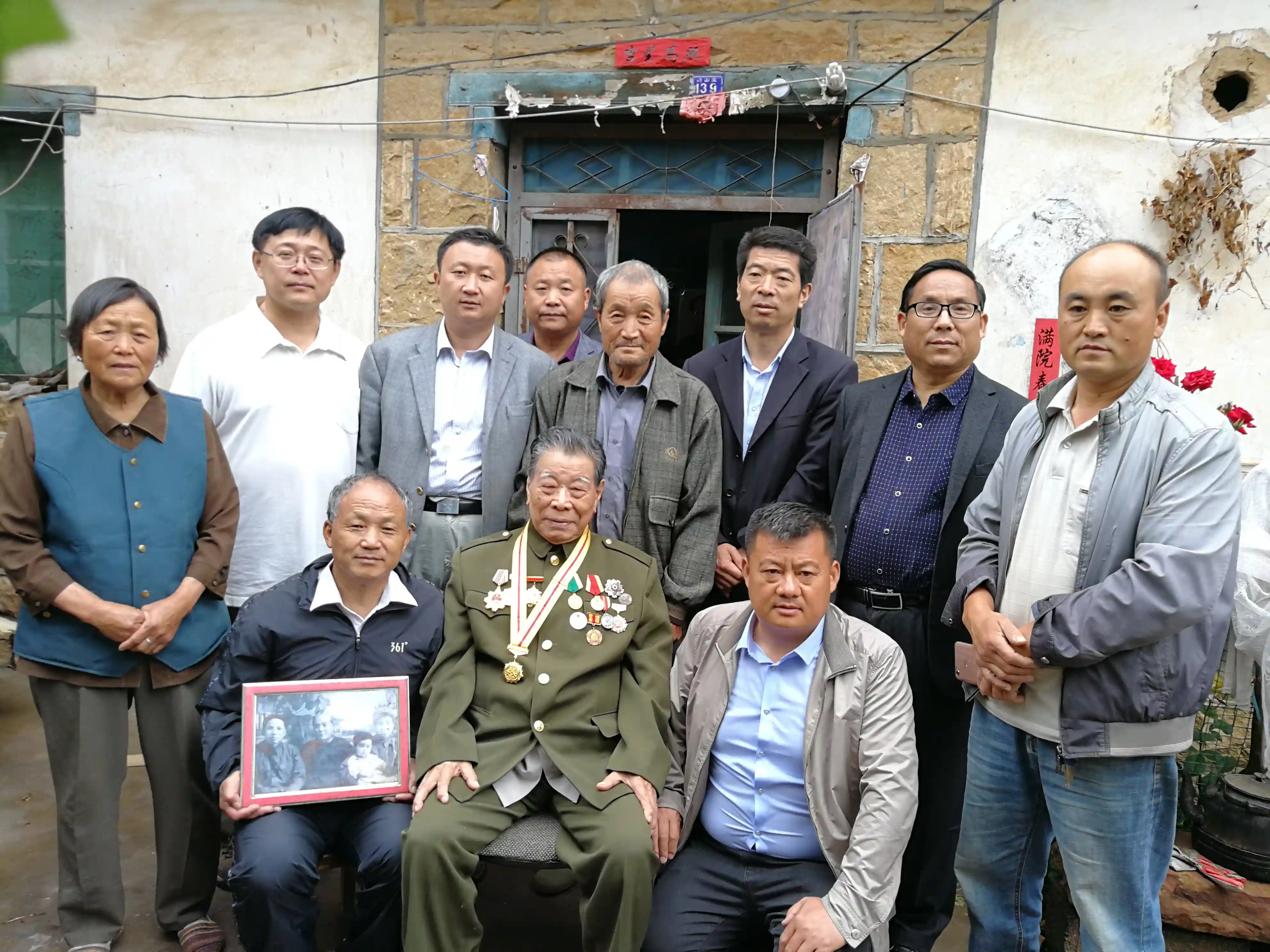 2018年5月,宗树坤的“宣大”战友魏瑞珍(前排中)在院东头镇领导和有关人员陪同下,与宗树坤家人在峙山庄