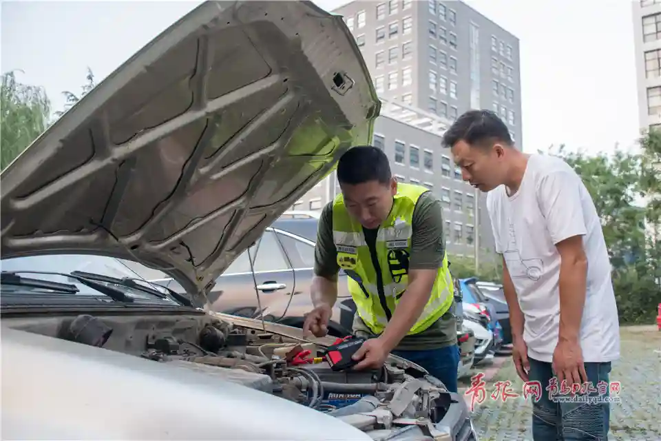 在市南软件园某停车场,青岛“好司机”志愿服务团队于秀鹏用应急启动电源启动故障车。