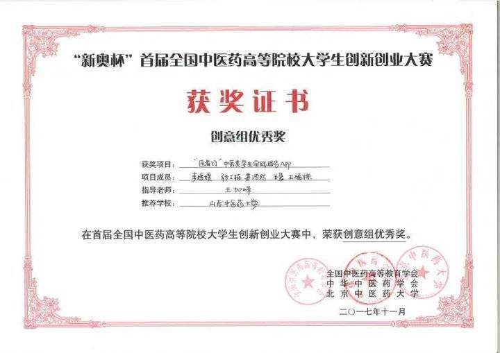 学院建立教学与科研互动的创新教育体制,培养学生科研创新意识、创新能力、创新精神。近3年SRT科研项目(大学生创新创业训练项目计划)国家级立项6项,省级立项5项,校级立项43项。依托学校创业孵化基地,学生创办济南真艾堂艾灸制品有限公司等16家注册公司,部分公司年销售额达到1000万元。省级以上大学生科技创新、创业项目获奖10余项:首届全国中医药高等院校大学生创新创业大赛获创业组银奖一项,第二届全国中医药高等院校大学生创新创业大赛获金奖一项、银奖一项,创新组铜奖一项;“创青春”·海尔山东省大学生创业大赛银奖两项;“建行杯”第五届山东省“互联网+”大学生创新创业大赛获得银奖两项、铜奖一项等。