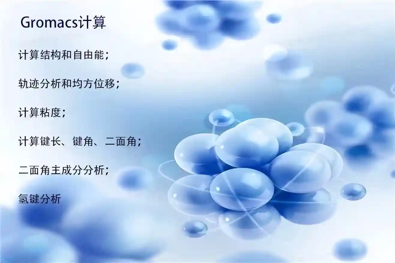 计算结构和自由能;轨迹分析和均方位移;RMSD分析;RMSF分析;Cα角的分析;计算键长、键角、二面角;二面角主成分分析;氢键分析。