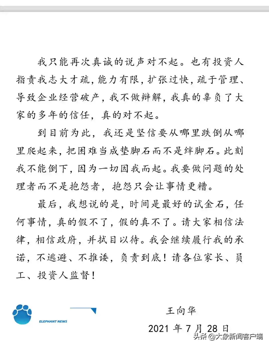 在第一封公开信中,王向华写道“现在不少家长要退学费,但我现在真的退不了,公司真的已经弹尽粮绝。我现在需要时间,把欠大家的一点点还回去。”