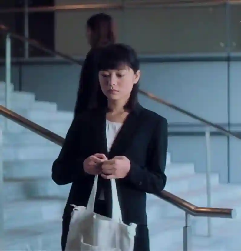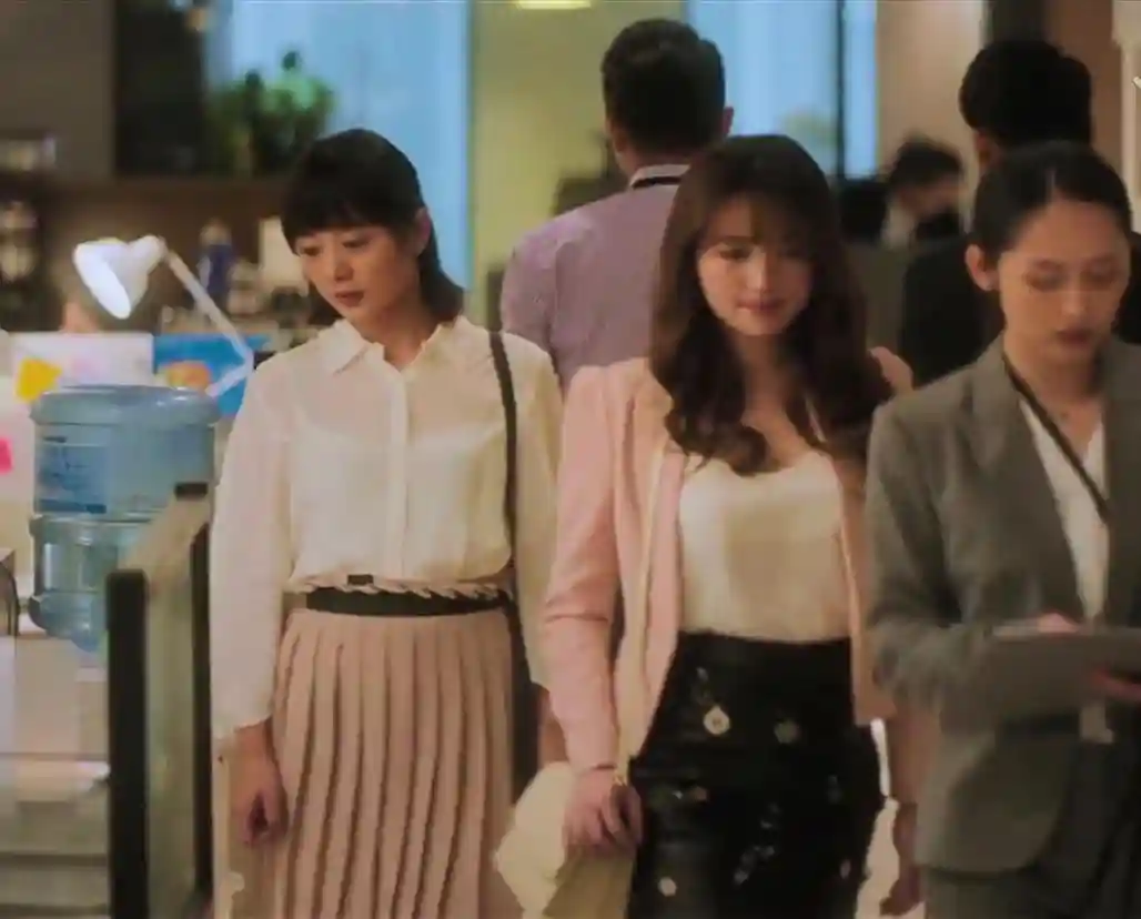 面试通过,正式入职。她穿的雪纺白衬衫+卡其色百褶裙,虽然看起来没什么质感,但多少有点职场人的感觉了。