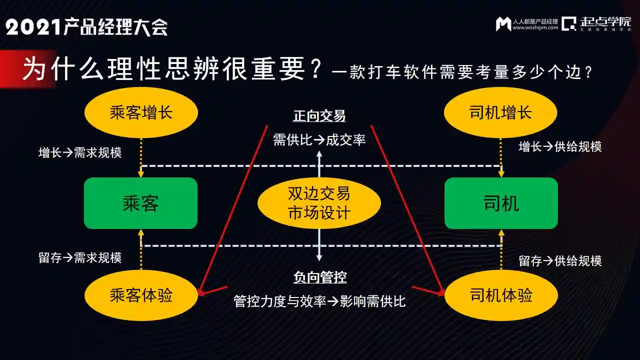 我们可以发现,这两个问题是相互制约的。当我们去考虑一个双边市场交易时,正向来看,我们考虑的是供需比,只要我们把供需比提高了,成交率也能够提高。
