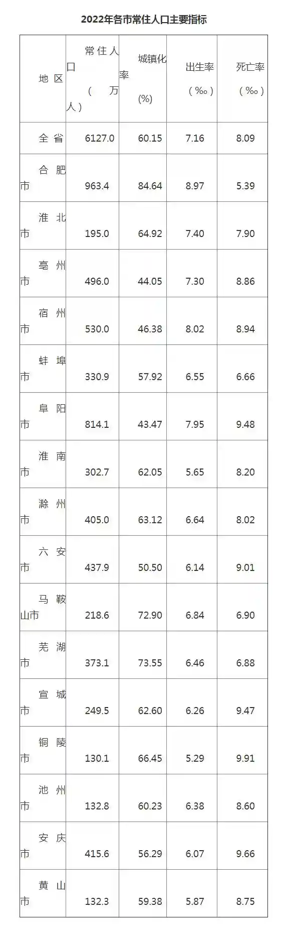 2022年末,安徽全省常住人口6127万人,比上年增加14万人,增长0.23%,同2020年安徽省第七次全国人口普查的6103万人相比,共增加24万人,年均增加12万人,年平均增长率为0.2%。
