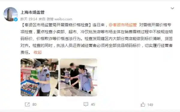 7月6日,上海奉贤区市场监管对雪糕开展价格专项检查,重点检查小卖部、超市、冷饮批发店等市场主体在销售雪糕过程中不按规定明码标价、价格欺诈等价格违法行为。检查的同时,执法人员还告诫经营者必须将全部货品明码标价,切实履行经营者责任。