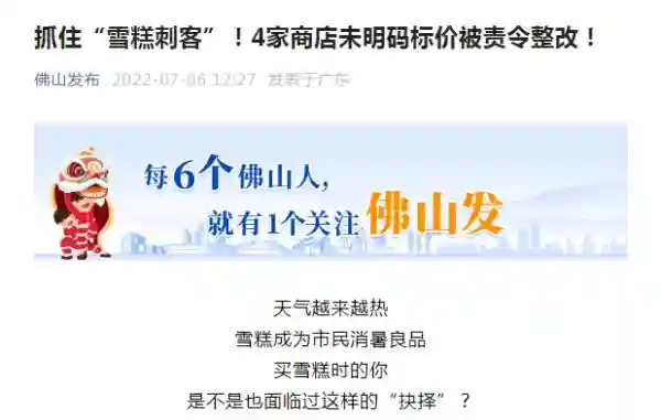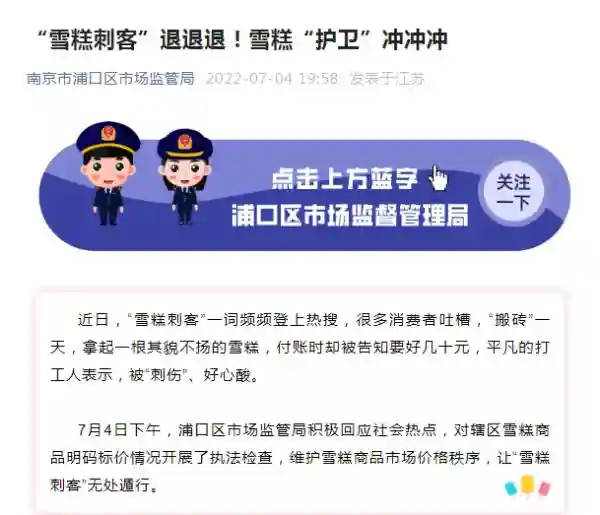 7月4日,广东佛山顺德区市场监督管理局执法人员以商场、便利店、零食店为重点对象,针对近期热议的“雪糕刺客”现象,对雪糕产品开展价格监督检查。其中重点检查经营者是否存在故意不标示或者显著弱化标示高价雪糕等诱骗消费者购买的价格欺诈行为。4家涉嫌未明码标价的商店被要求立即整改。