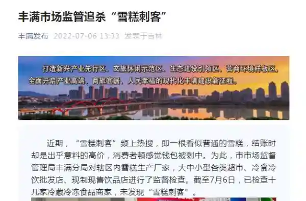 7月6日,据丰满发布消息,近期,吉林市市场监督管理局丰满分局对辖区内雪糕生产厂家、大中小型各类超市、冷食冷饮批发店、现制现售饮品店进行了监督检查。截至7月6日,未发现“雪糕刺客”。
