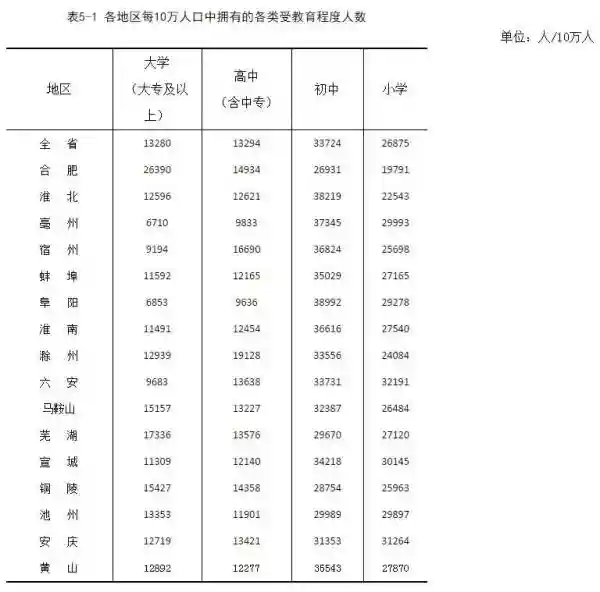 全省常住人口中,拥有大学(指大专及以上)文化程度的人口为810.5万人;拥有高中(含中专)文化程度的人口为811.3万人;拥有初中文化程度的人口为2058.1万人;拥有小学文化程度的人口为1640.1万人(以上各种受教育程度的人包括各类学校的毕业生、肄业生和在校生)。