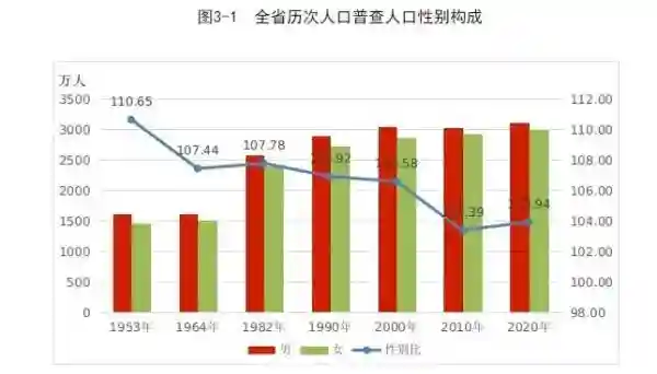 全省常住人口中,男性人口为3110.3万人,占50.97%;女性人口为2992.4万人,占49.03%。常住人口性别比由第六次人口普查的103.39略升为103.94,人口性别比基本稳定。