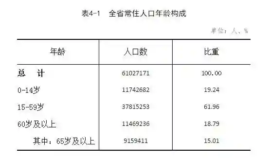 全省常住人口中,0-14岁人口为1174.3万人,占19.24%;15-59岁人口为3781.5万人,占61.96%;60岁及以上人口为1146.9万人,占18.79%,其中65岁及以上人口为915.9万人,占15.01%。