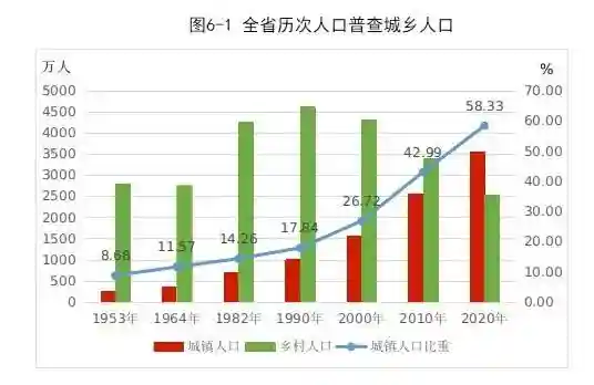 全省常住人口中,居住在城镇的人口为3559.5万人,占58.33%;居住在乡村的人口为2543.2万人,占41.67%。与第六次人口普查相比,城镇人口增加1001.8万人,乡村人口减少849.1万人,城镇人口比重上升15.34个百分点。