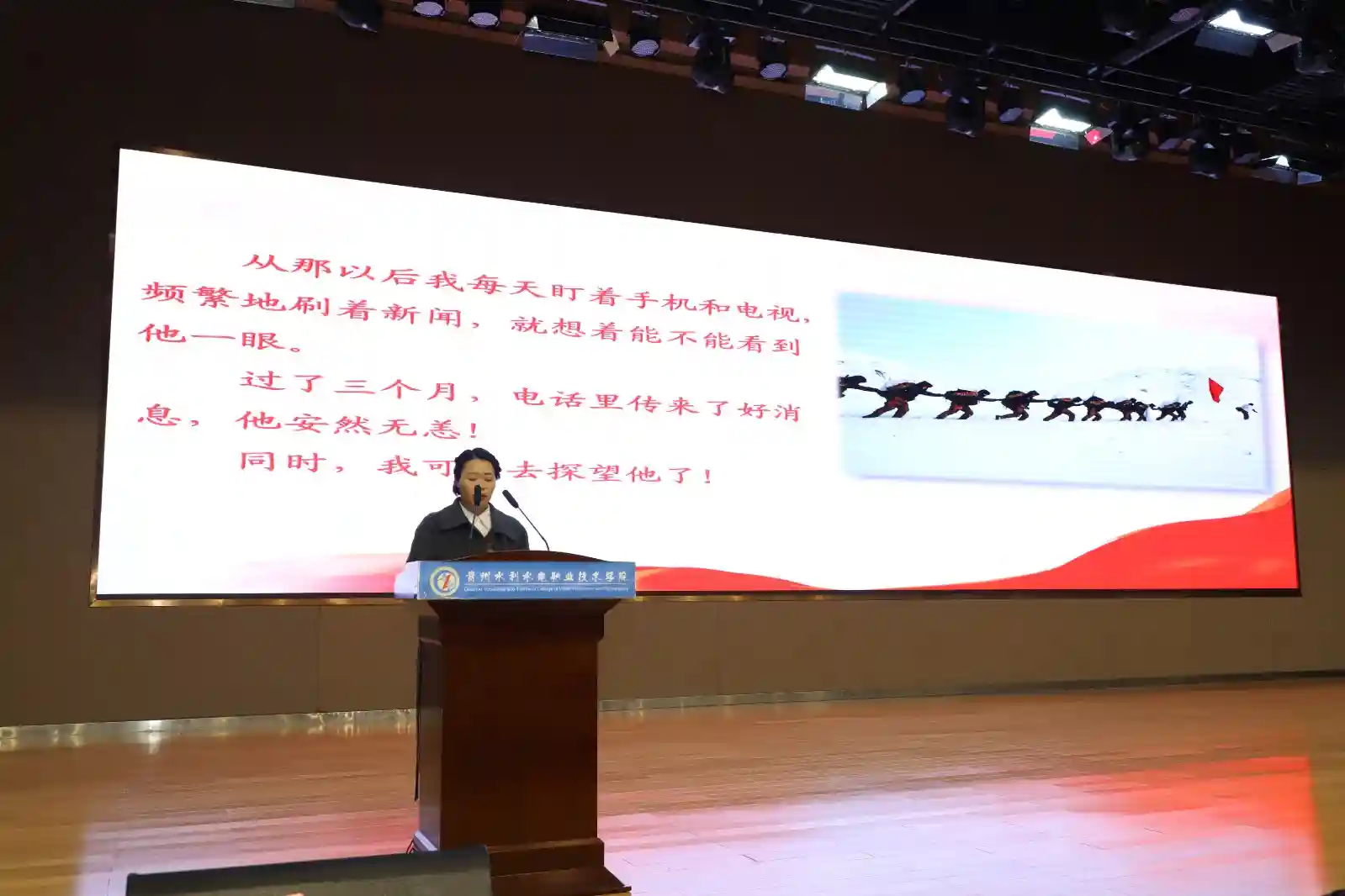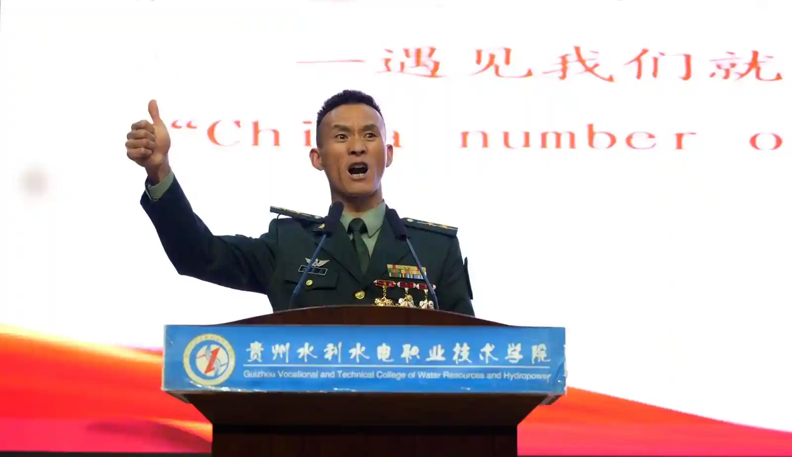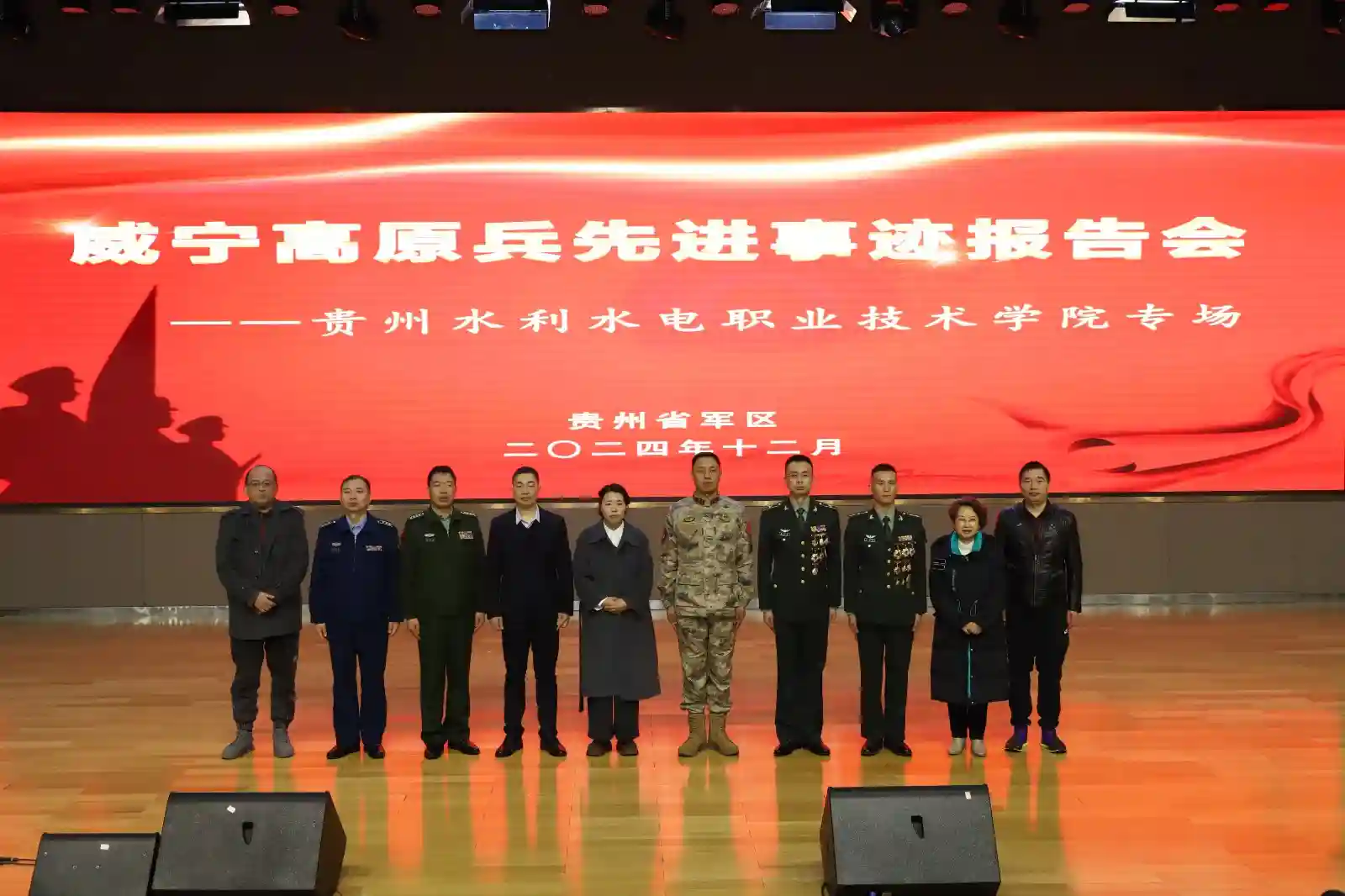 12月17日,贵州水利水电职业技术学院的大礼堂内座无虚席,来自清镇职教城11所高校的500余名军事兴趣类社团学生代表,正在聆听来自西藏军区某团军官赵海永、西藏军区某部军官钱秉辉、大阅兵“标兵”朱锡龙、高原兵朱全广家属罗春军警记者站站长欧阳海南带来的精彩演讲。五位“功臣”从不同的视角,用自己的亲身经历为现场师生带来的震撼心灵的报告。