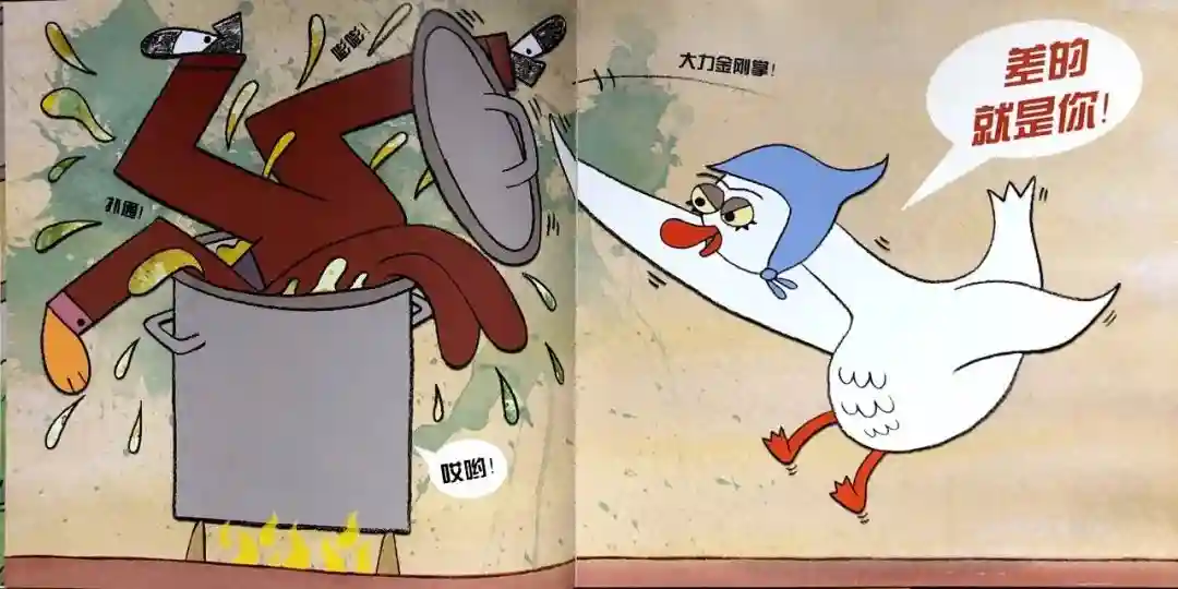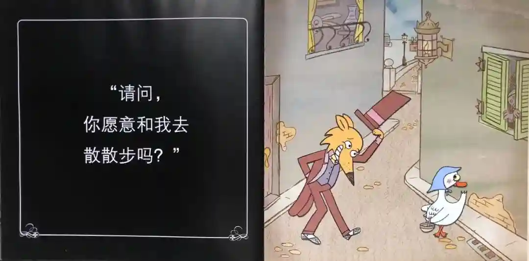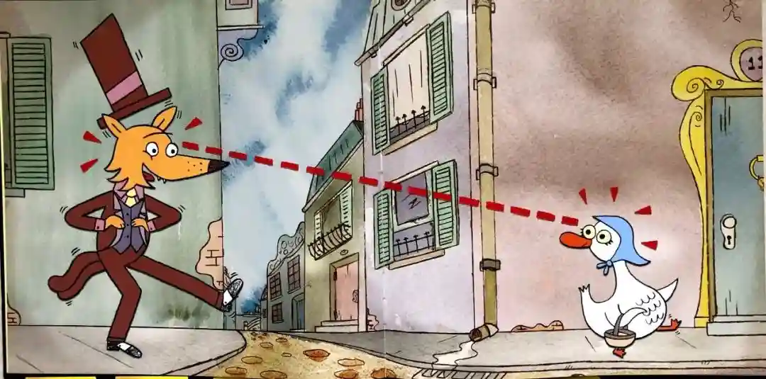 1.故事开篇,狐狸先生身穿整洁的西装、马甲三件套、头戴着高礼帽,俨然一副衣冠楚楚、道貌岸然的好人模样。它和马路对面的一只肥鹅妈妈四目相对,一根红色的“视线”牵住了彼此,而且它们俩都是“灵光一现”的表情,大有相见恨晚之感。狐狸和鹅妈妈的这种身高差会让读者不自觉的带入“这只白鹅有危险”的意识中去,到最后就更容易被突然反转的结局逗得哈哈大笑。