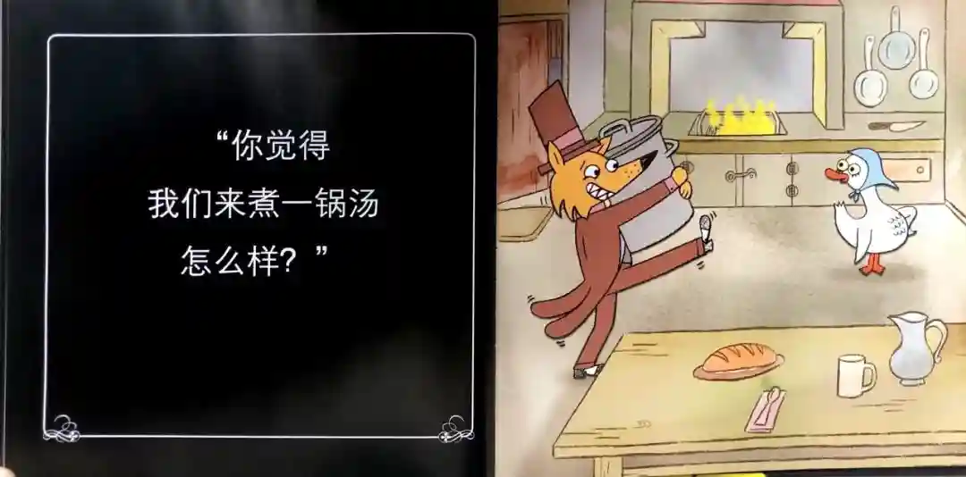 2.书中所有角色的心理活动都是用一整页描述,黑色的背景、白色的宋体,非常醒目,到小鹅们说“千万别上当”时,字体着重的发生了变化,增加了故事的严肃和紧迫感!