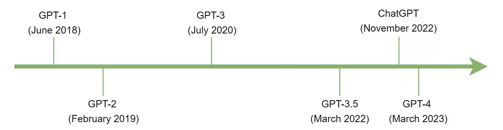 更具体地说,GPT的第一个版本(GPT-1)是由OpenAI于2018年发布的。随后,GPT-2和GPT-3分别于2019年和2020年发布。然而,当时知道GPT的人并不多,因为它只能通过API使用。直到2022年,OpenAI才发布了带有后端的ChatGPT,让公众可以轻松地与这个LLM进行交互。下图显示了GPT模型的演变。