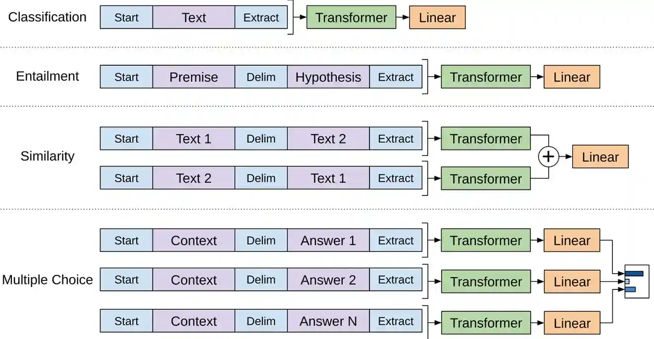 论文中实验了四种不同的下游任务:分类、自然语言推理(蕴涵)、句子相似度和多项选择题回答。下图说明了这些任务的工作流程。