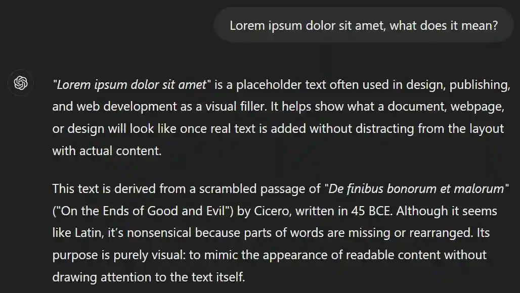例如,如果你用“loremipsumdolorsitamet”提示模型,它很可能会继续使用“consecteturadipiscingelit”。但如果你在提示中包含“这是什么意思?”这样的任务,模型就会解释它到底是什么。我在ChatGPT中尝试过这个,答案正是我所期望的。
