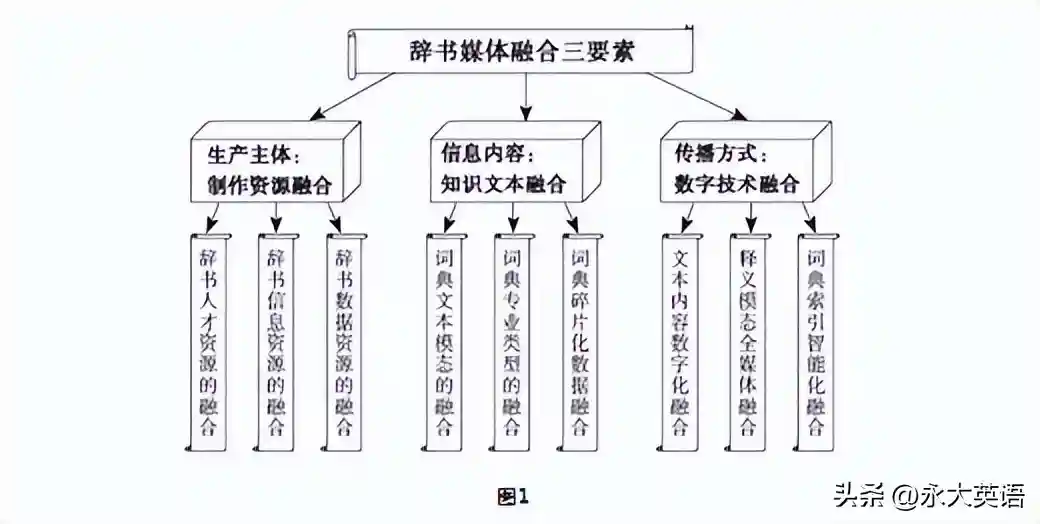 既然“融合”是融媒辞书的核心内涵,那么首先就须搞清融合的对象或要素。广义上讲,“媒体融合”涉及一切媒介及其相关要素的汇聚、组合和融合,它通过促进横向整合,重新定义行业界限,包括信息生产主体、信息内容,以及传播方式和介质等(McPhillipsMerlo2008)。这与词典项目的运行环节完全吻合:(1)信息生产主体——词典编纂团队或机构;(2)信息内容——词典文本内容;(3)传播方式和媒介——出版方式和发行渠道。媒体融合‒融通的对象或要素就包含在这3个环节中(见图1)。