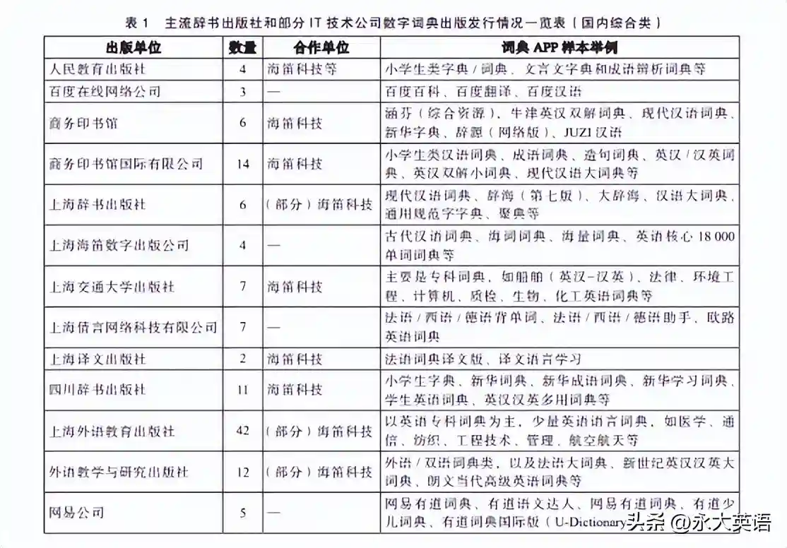 根据项目研究的需要,我们从搜集到的2000多种词典APP中抽取了200多种进行重点分析,结合国内外研究发现:国外辞书界并没有明确的“融媒词典”的概念,更没“融媒词典学”的研究;但自2010年开始,就出现了多模态词典学(Lew2010),同时国内也开始探讨双语词典的多模态趋势(党军2010),或多模态电子词典的功能(罗永胜2015;钱亦斐2016)。“融媒辞书”是中国辞书学会于2019年应数字出版发展需要提出来的创新概念,与这一概念相关的论文已经发表10多篇,其中部分文章虽然提出了“融媒”概念,但仍沿用传统词典的叙事方法,也有结合特定词典的编写提出的“融媒操作”的思考(王兴隆,亢世勇2021;杨玉玲2022);还有部分是对现有数字词典的“融媒特征”评价,指出了现有词典APP存在的“融媒”问题(唐舒航2021;解竹2021)。主流辞书出版社也先后推出一批数字化辞书(见表1)。下面结合实例从融媒辞书的制作资源、知识文本和数字技术3个方面来考察现有数字词典的融媒特征如何实现及其发展现状。