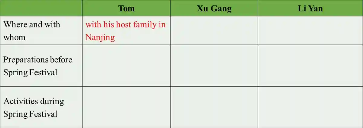 学生能够根据表格提示梳理出三个陈述者在春节期间的个人体验。通过细读文章,增强学生处理文章细节的能力。