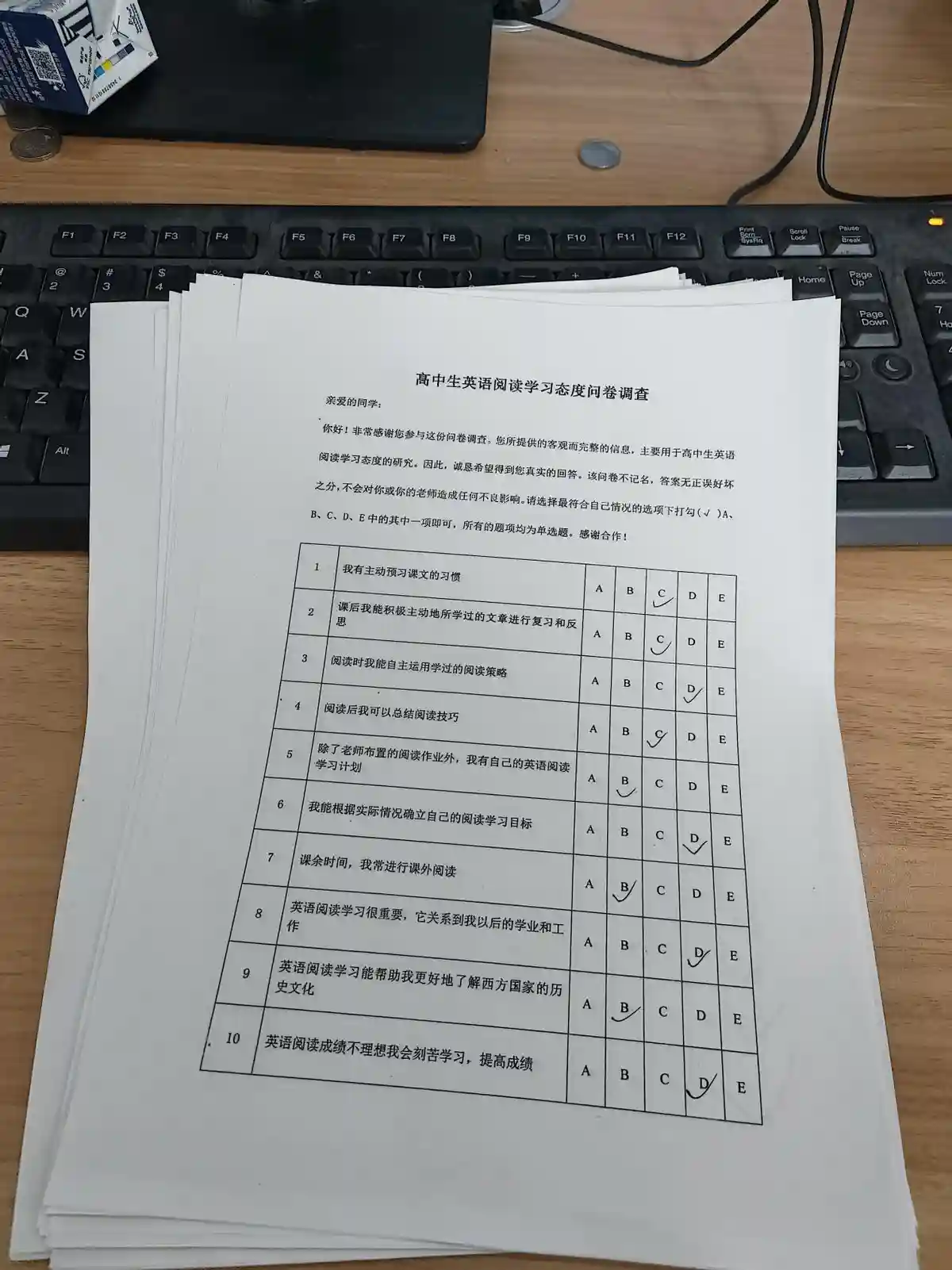 实验后期:2024年1月份期末考试考完之后,继续收集对照班和实验班的期末英语考试成绩分别整理好阅读理解项得分。然后在实验班发放问卷调查表,最后收集问卷调查数据、以及测试前后分数。